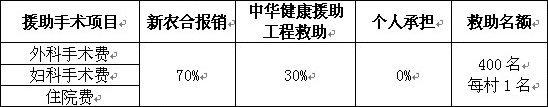 仅限农村己生育女性,对需要进行外科手术(阑尾手术、腹股沟斜疝修复术、甲状腺手术)、妇科手术(子宫肌瘤、卵巢囊肿、宫颈修复、妇科整形、无痛人流等)的农村贫困母亲手术费除新农合报销以外,其余部分由中华健康援助工程给予救助,名额400名,原则上每个村限1 名。