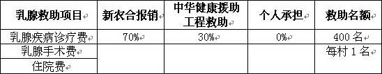 仅限农村己生育女性,对各项乳腺疾病的诊疗费用、乳腺手术费除新农合报销以外,其余部分由中华健康援助工程给予救助,名额400名。